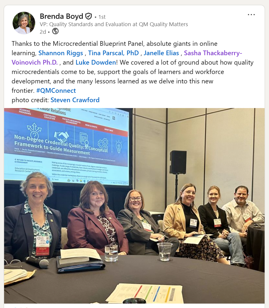 This Fall, our founder, Dr. Sasha Thackaberry-Voinovich, presented Newstate University’s unique stackable credential model as part of a panel on micro-credentials at the yearly QM Connect conference. Other institutions representing included Oregon State University eCampus, Colorado Community Colleges, Rio Salado College, and Alamo Community College.